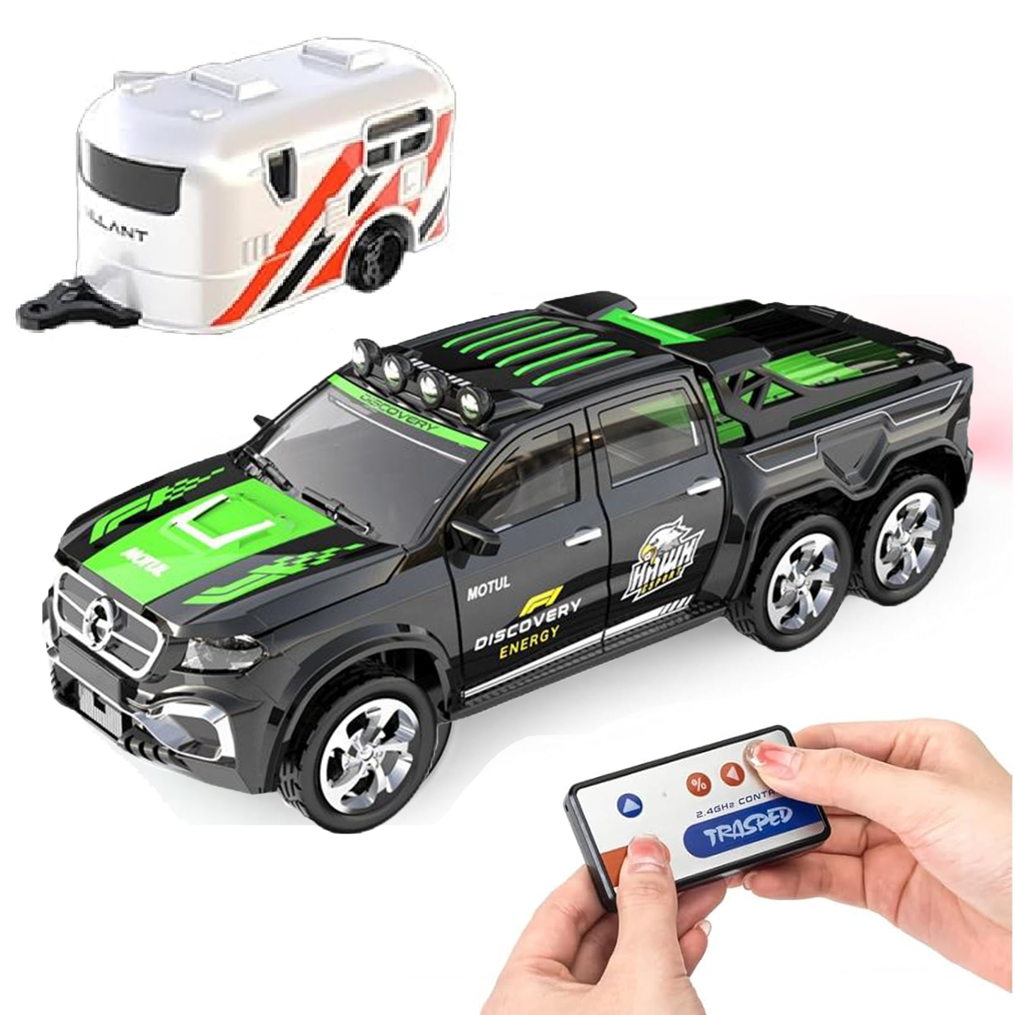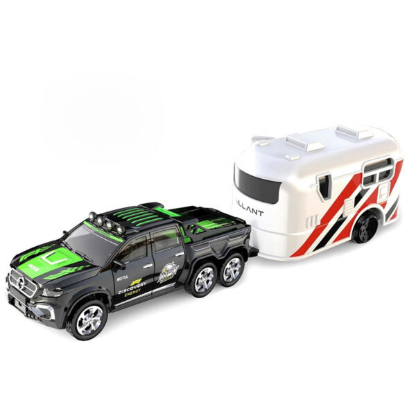 | Remote Control 6 Wheels Mini Pickup Truck with Caravan Trailer - Scale 1:64 (Black) | Description Hit the road with adventure! Experience off-road adventure with this 6-wheel RC Truck with Caravan Trailer! Equipped with 2.4GHz remote control, smooth suspension, and realistic detailing — this toy truck is perfect for kids and collectors. The detachable trailer adds more fun for camping-style play. Durable, stylish, and full of energy — the ultimate RC vehicle for endless entertainment! Product function introduction: 3.7V rechargeable battery, forward, backward, left and right turn, speed regulation, headlight, rear light and other functions. |